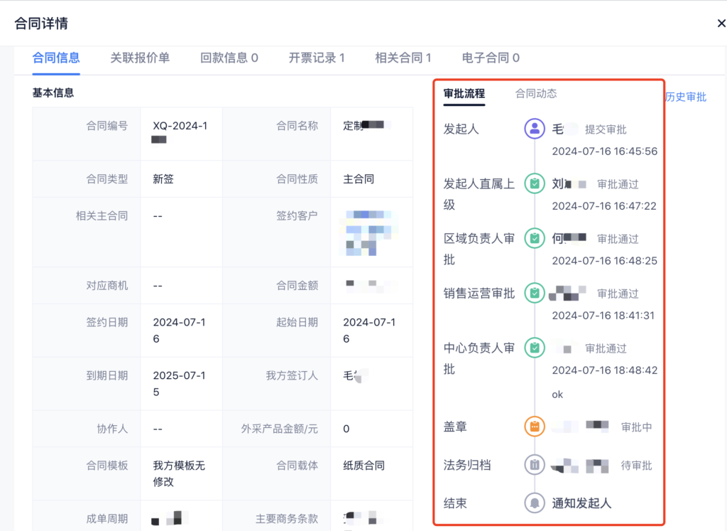 打开合同/开票详情,即可看到流程最新的审批节点与审批内容。