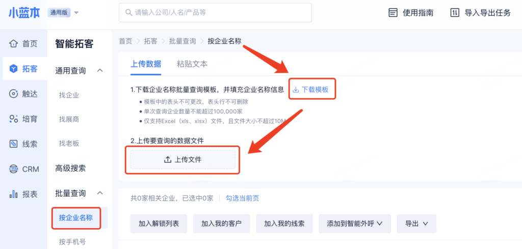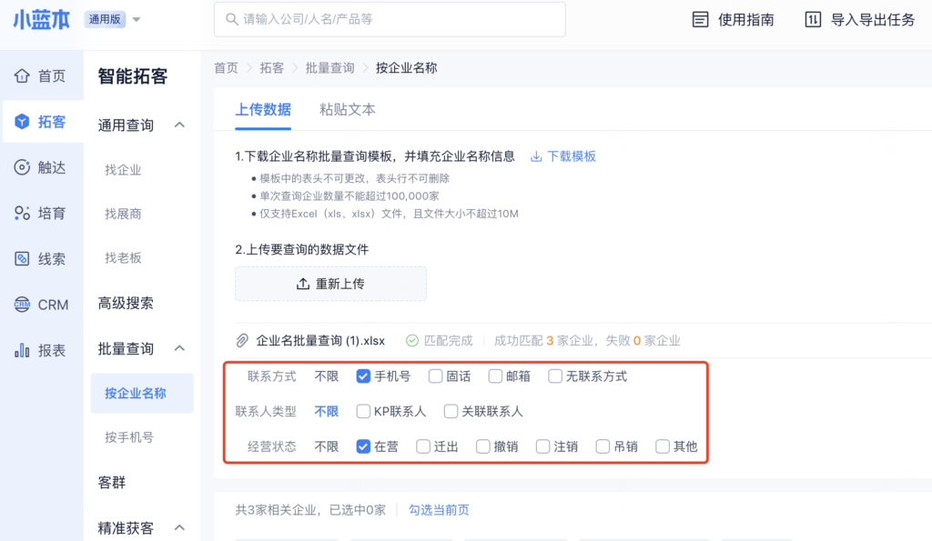 【批量查询】-【按企业名称】支持上传企业名单,批量匹配获取企业更多信息(包括联系方式)。
