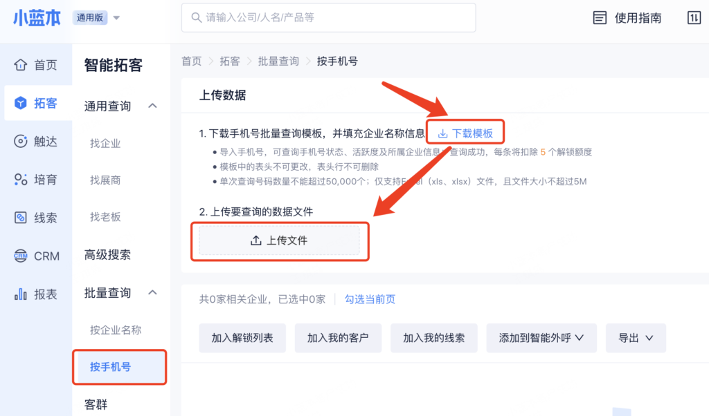 上传文件后,在结果列表上方筛选必要条件,如有”手机号“且”在营“,再进行导出/加入到线索/客户/解锁列表即可。