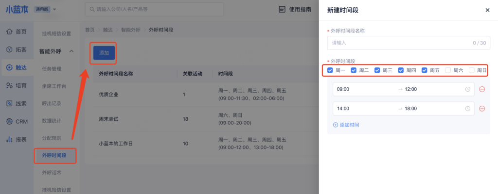 进入【触达】-【智能外呼】-【外呼时间段】,提前自定义AI外呼时间段,用于后续机器人呼叫任务的设置。支持多个时间段,支持区分工作日。