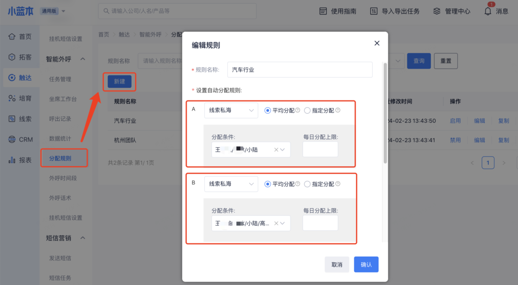 进入【触达】-【智能外呼】-【分配规则】,可提前自定义多个分配规则,在后续呼出各类意向线索时,按预设的规则分配给员工,如 :