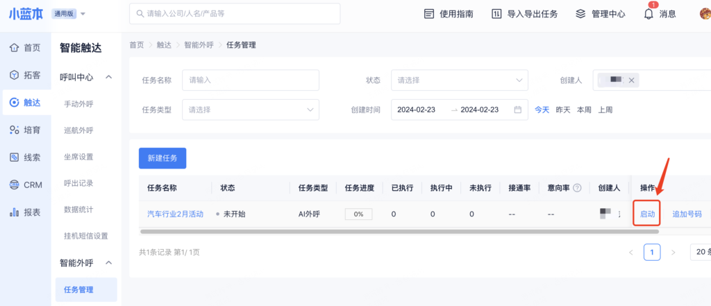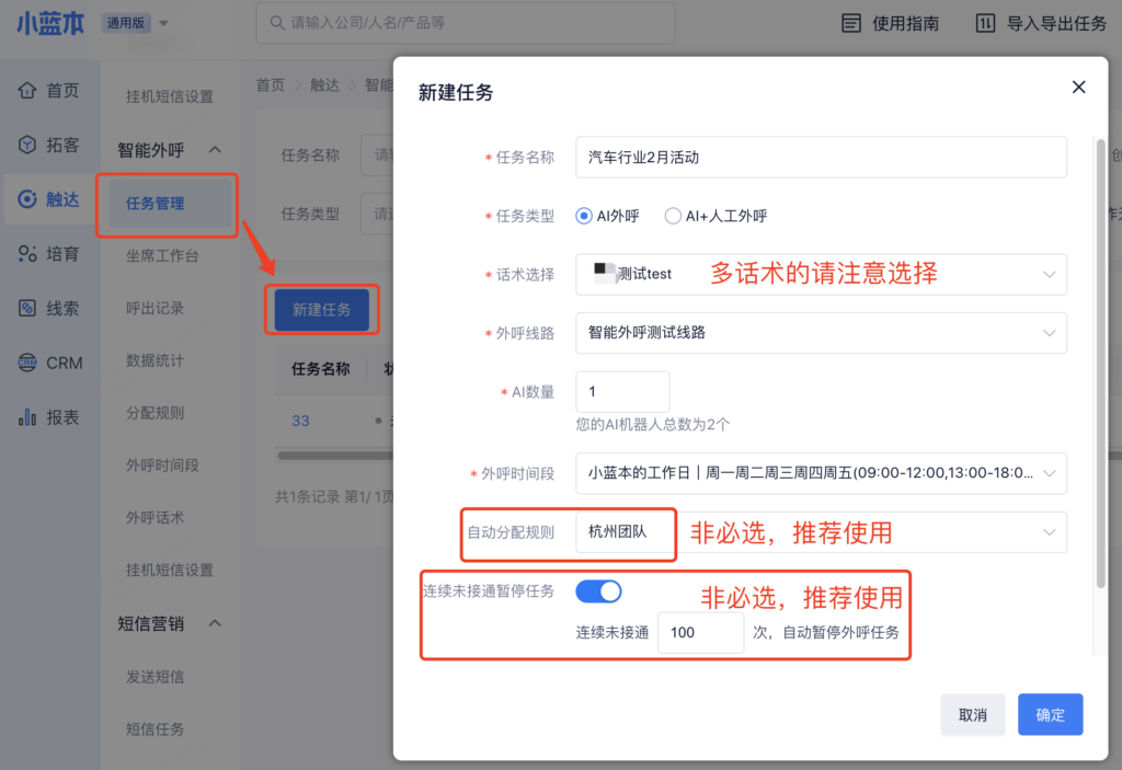 进入【触达】-【智能外呼】-【任务管理】,点击新建任务,选择话术、线路、所需的机器人数量、外呼时间段、分配规则等。