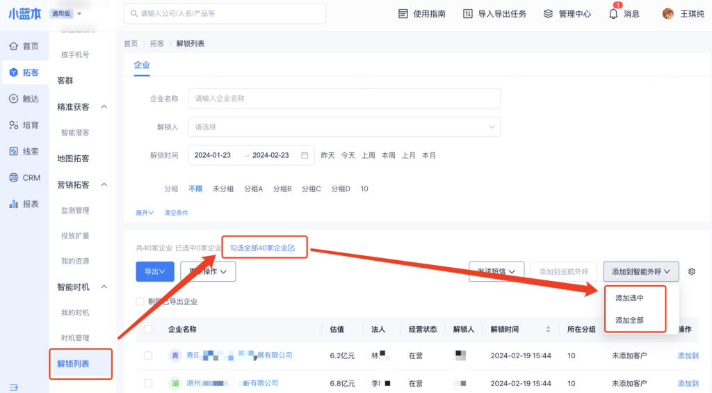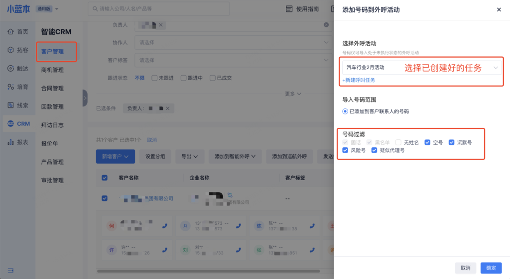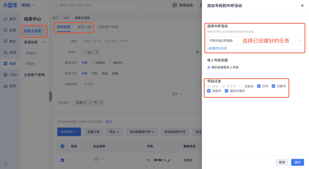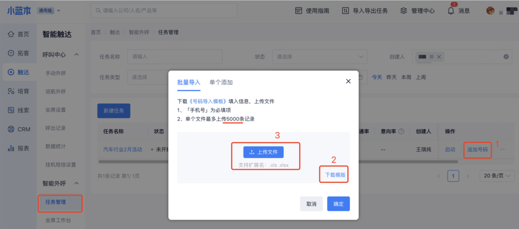 支持从【解锁列表】(推荐)/【线索全流程】(私池&公海)/【客户管理】(私池&公海)批量导入号码到任务;也支持表格批量导入(单次5000条)/手工单个添加号码。
