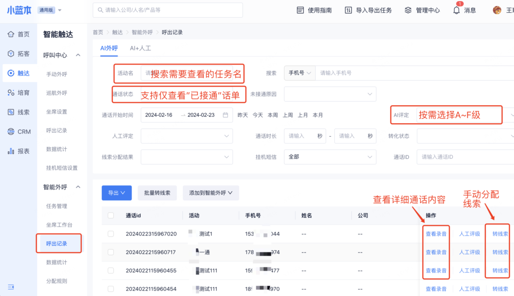进入【触达】-【智能外呼】-【呼出记录】,可筛选查看所有AI外呼记录和录音,且支持手动分配线索。