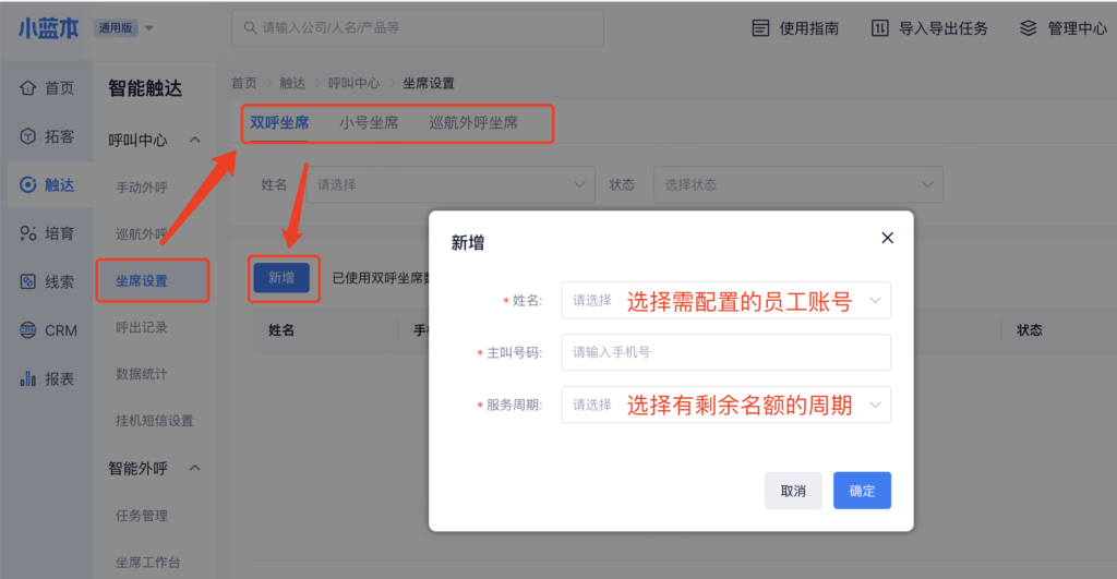 员工使用外呼功能前,需要给员工账号配置相应的坐席,进入【触达】-【呼叫中心】-【坐席设置】,选择对应外呼类型配置页面,点击新增坐席,选择相应员工和默认的服务周期保存即可。