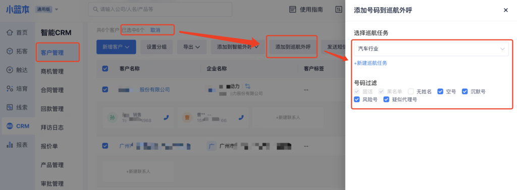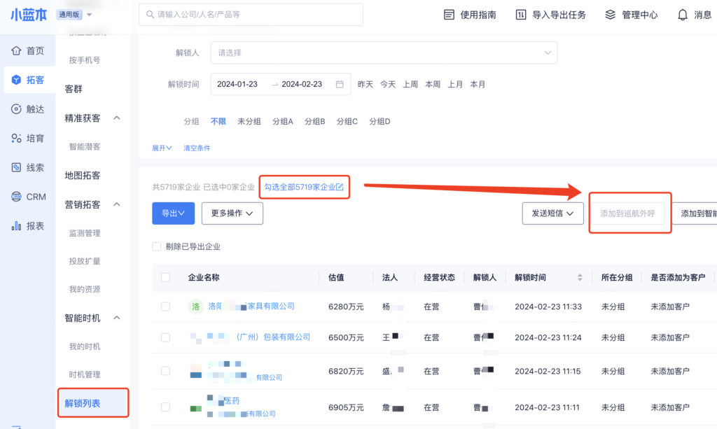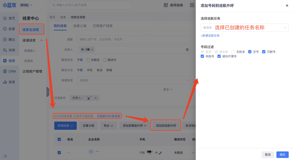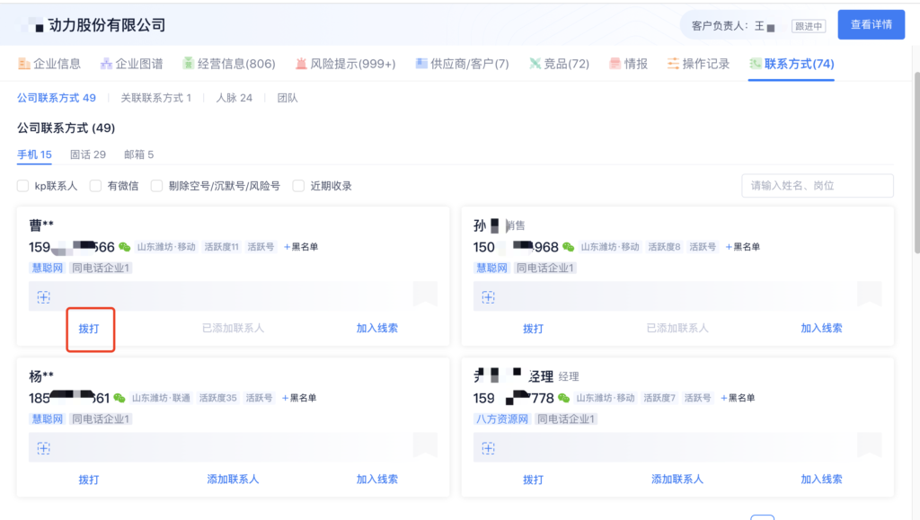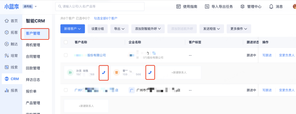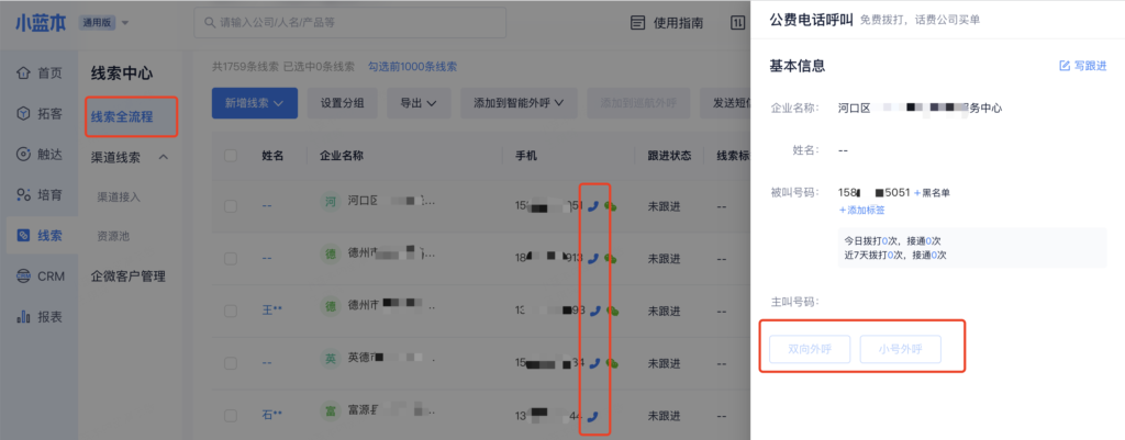 在小蓝本多个页面均支持对号码发起呼叫(客户管理、线索管理、已解锁的企业主页等),点击号码旁的呼叫按钮即可。