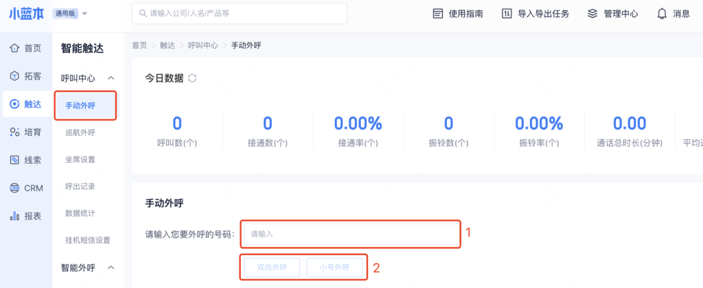如需直接输入特定号码拨打,进入【触达】-【呼叫中心】-【手动外呼】,输入号码,点击外呼按钮即可。