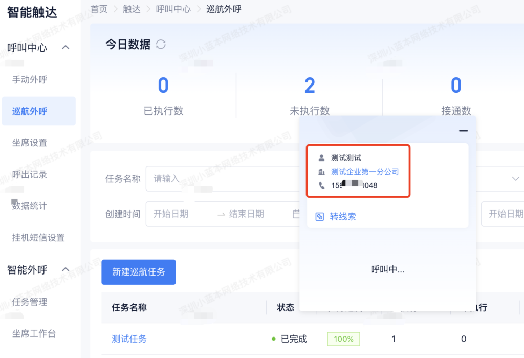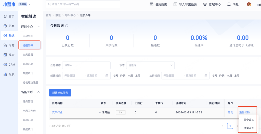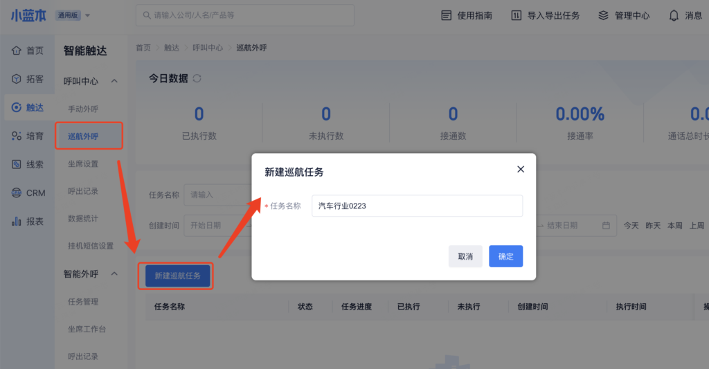 进入【触达】-【呼叫中心】-【巡航外呼】,新建巡航任务。