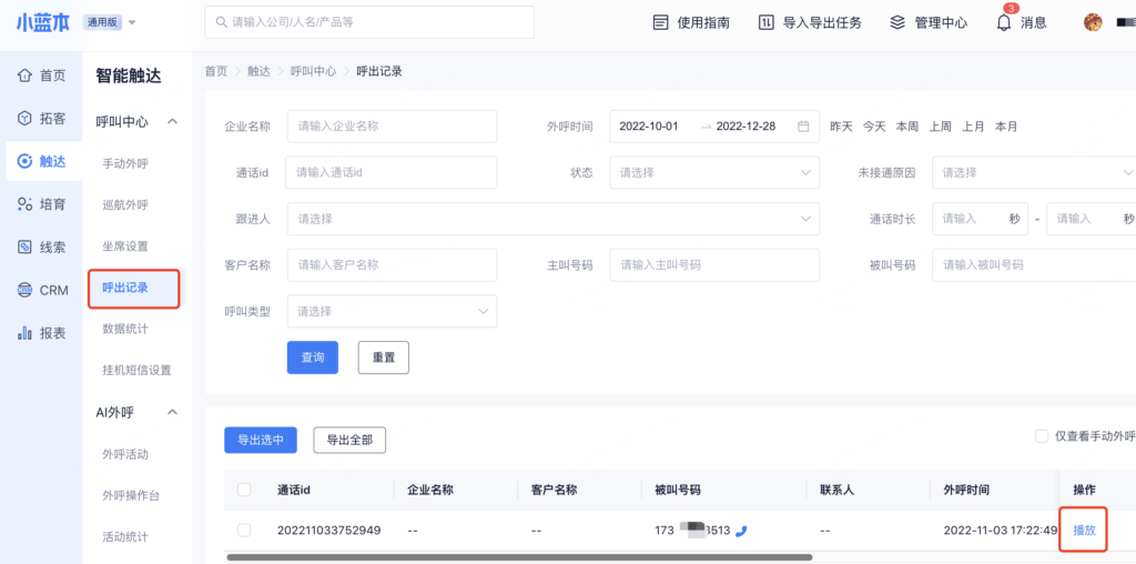 进入【触达】-【呼叫中心】-【呼出记录】,支持筛选查看详细通话记录,可播放或下载录音,点击播放录音时支持同步将语音转化为文本进行查看。