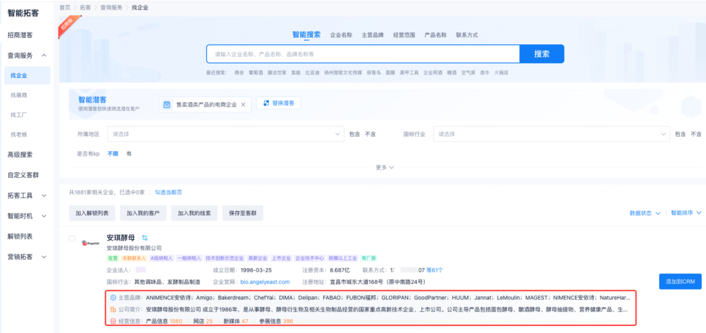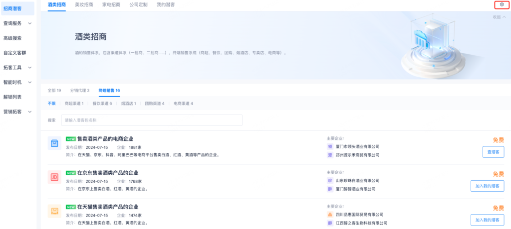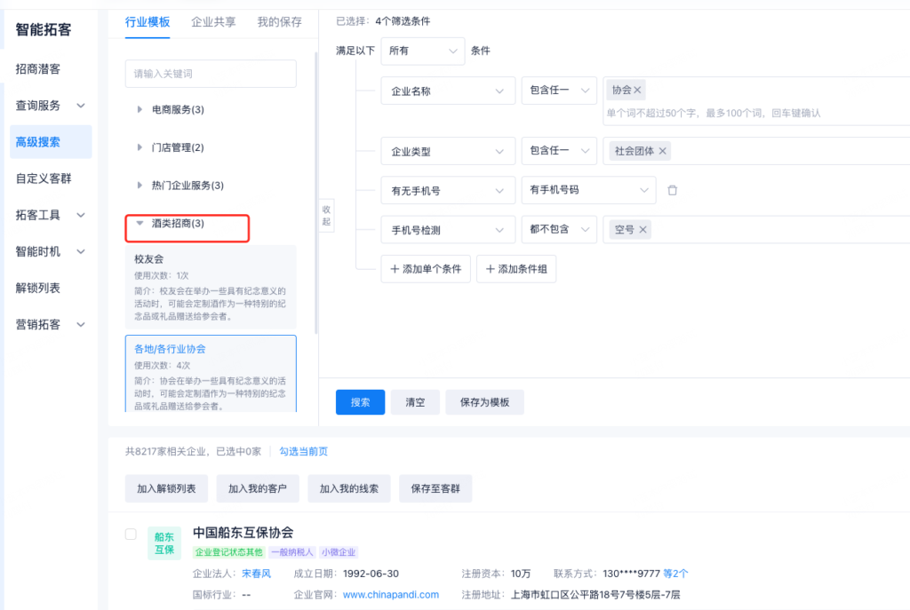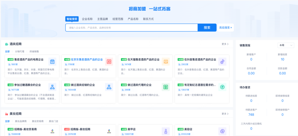 酒类招商、美妆招商、家电招商等专属高级搜索模版。