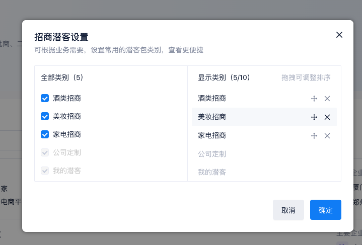 目前有酒类招商、美妆招商、家电招商,可以根据自己的业务场景,只展示自己需要的。点击右上角的设置按钮,可设置要展示的模块。