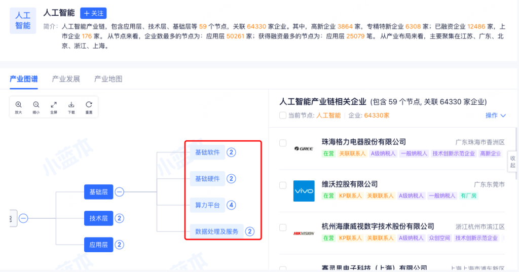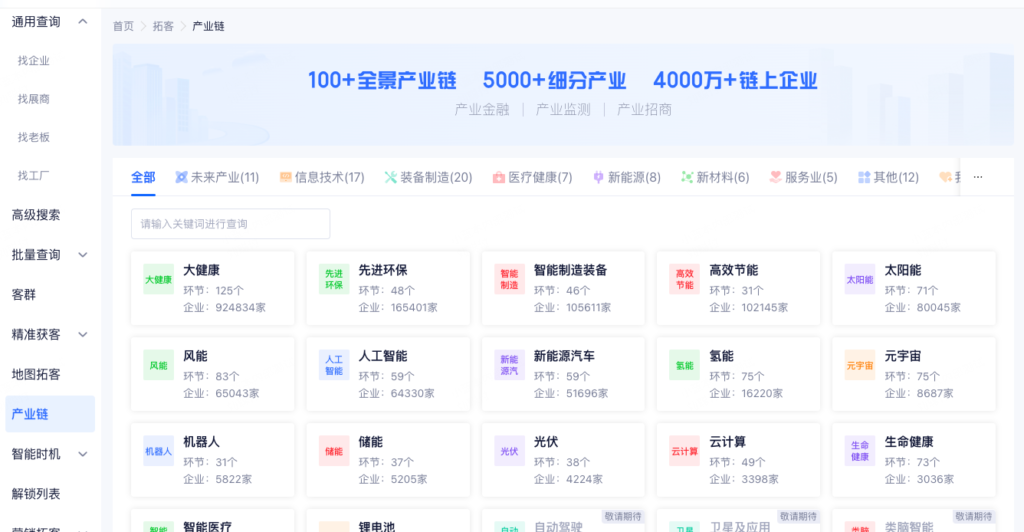 展示产业链各级节点及相关企业。左侧的节点可以展开和点击,右侧显示相关节点的企业。可以解锁、加线索、加客户。