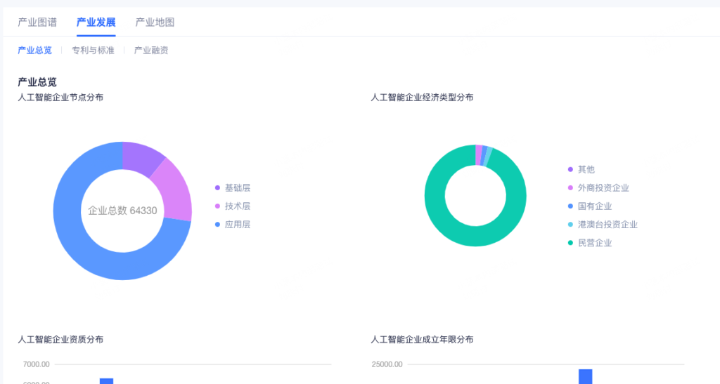 产业总览:产业链节点企业分布、经济类型分布、企业资质分布、成立年限分布、;