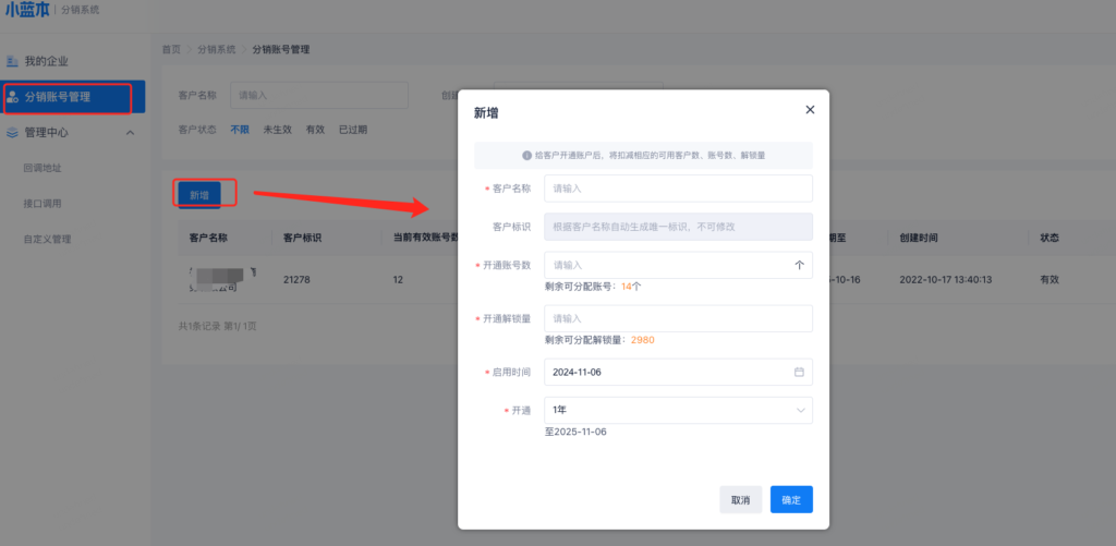 把自己企业当成一个客户,创建客户、分配账号数和解锁量。