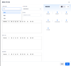 报告统计。支持单独开启 / 关闭日报、周报、月报的统计功能(如仅开启周报统计);若某周期统计(如日报)处于禁用状态,员工提交汇报时将自动隐藏该周期的提交入口。