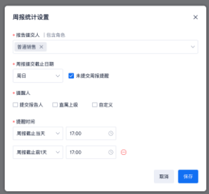 未提交提醒配置。开启统计后,可自定义未提交报告的提醒规则:选择提醒对象;设定提醒时间。